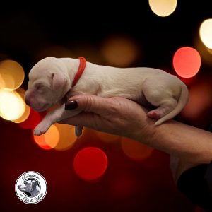 Hündin, weiß/braun, Halsbandfarbe Rot
